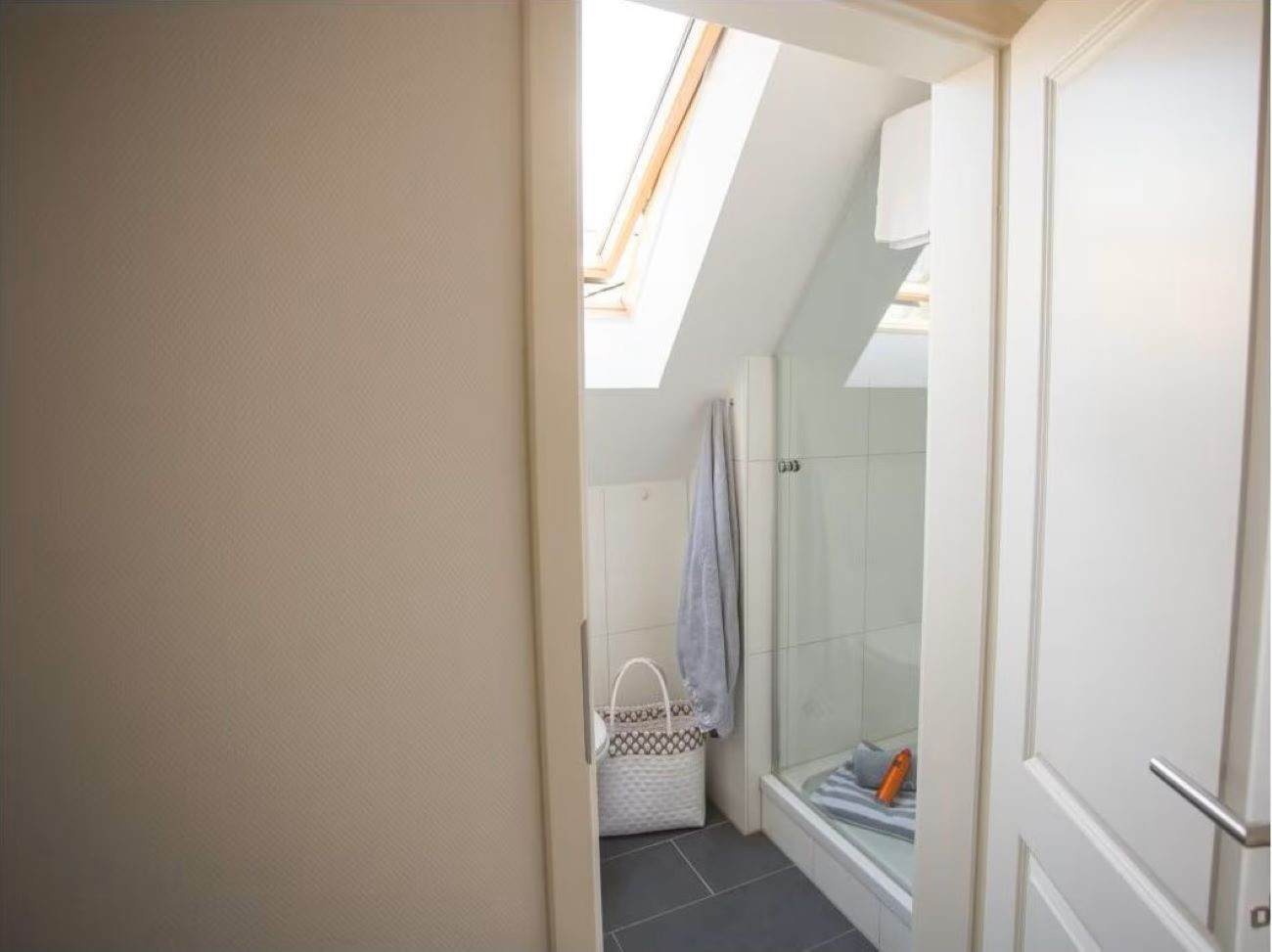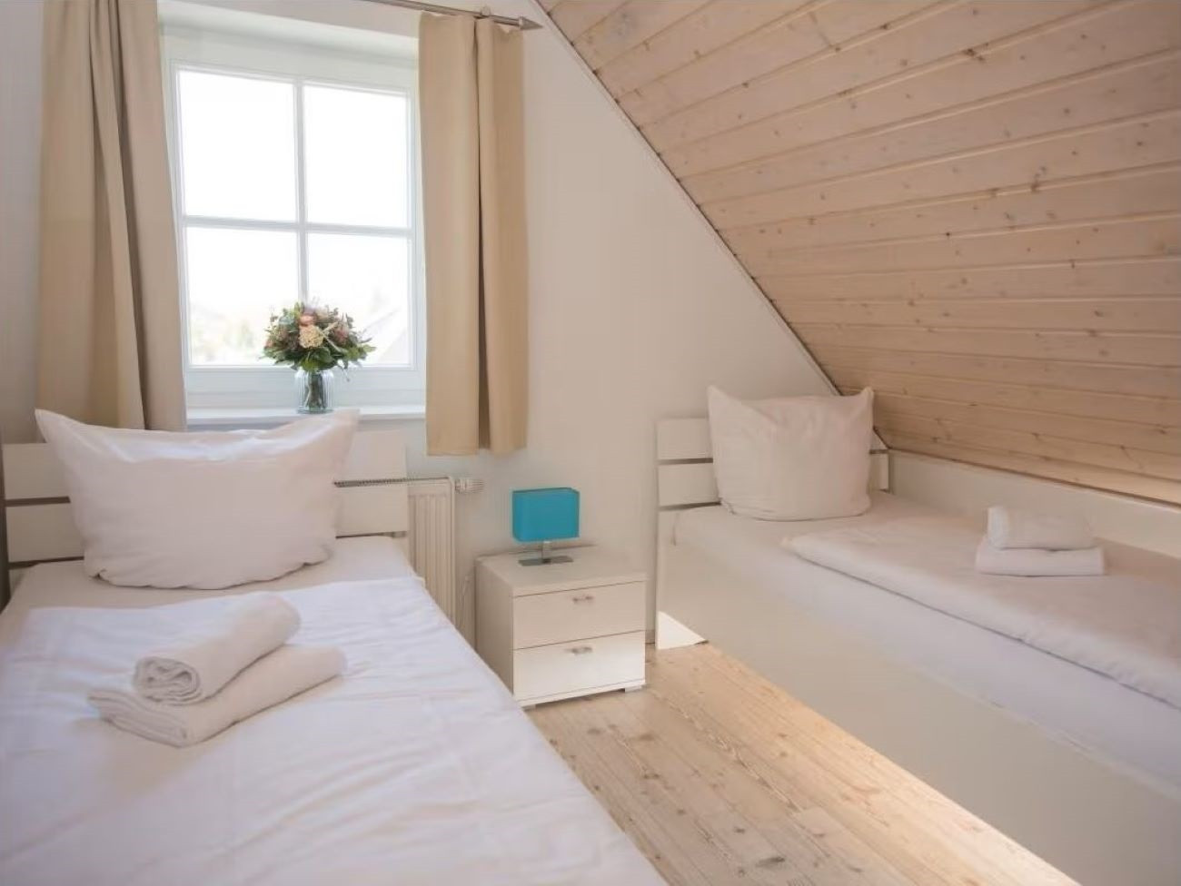 In der oberen Etage befinden sich zwei Schlafzimmer. 1x mit Doppelbett und 1x mit zwei Einzelbetten, sowie ein Bad mit Dusche und WC.